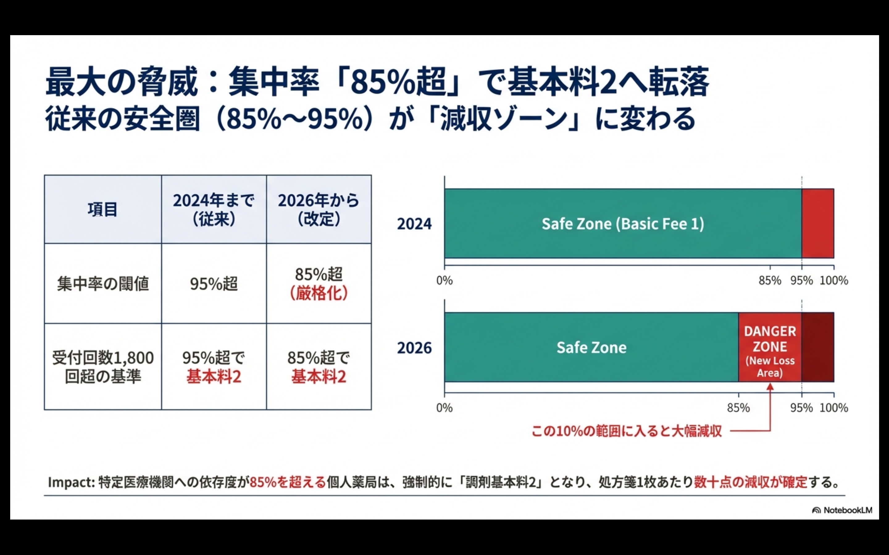 これまで「安全圏」とされていた集中率85〜95%の薬局が、一気に減収ゾーンへ転落する可能性があります。