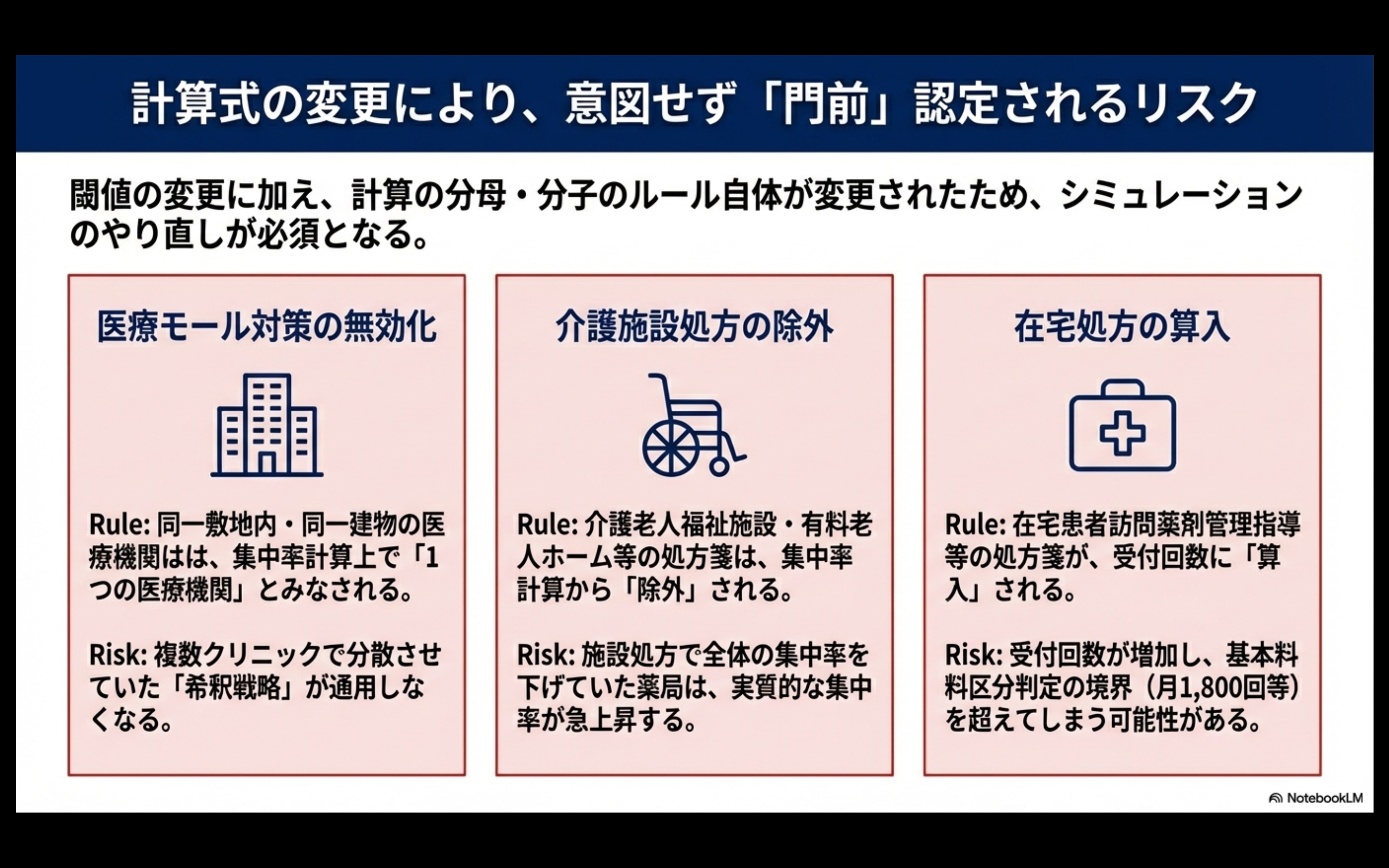 複数クリニックからの処方で集中率を分散させる戦略が通用しなくなります。モール内薬局は実質的な集中率が急上昇し、区分変更リスクが顕在化します。