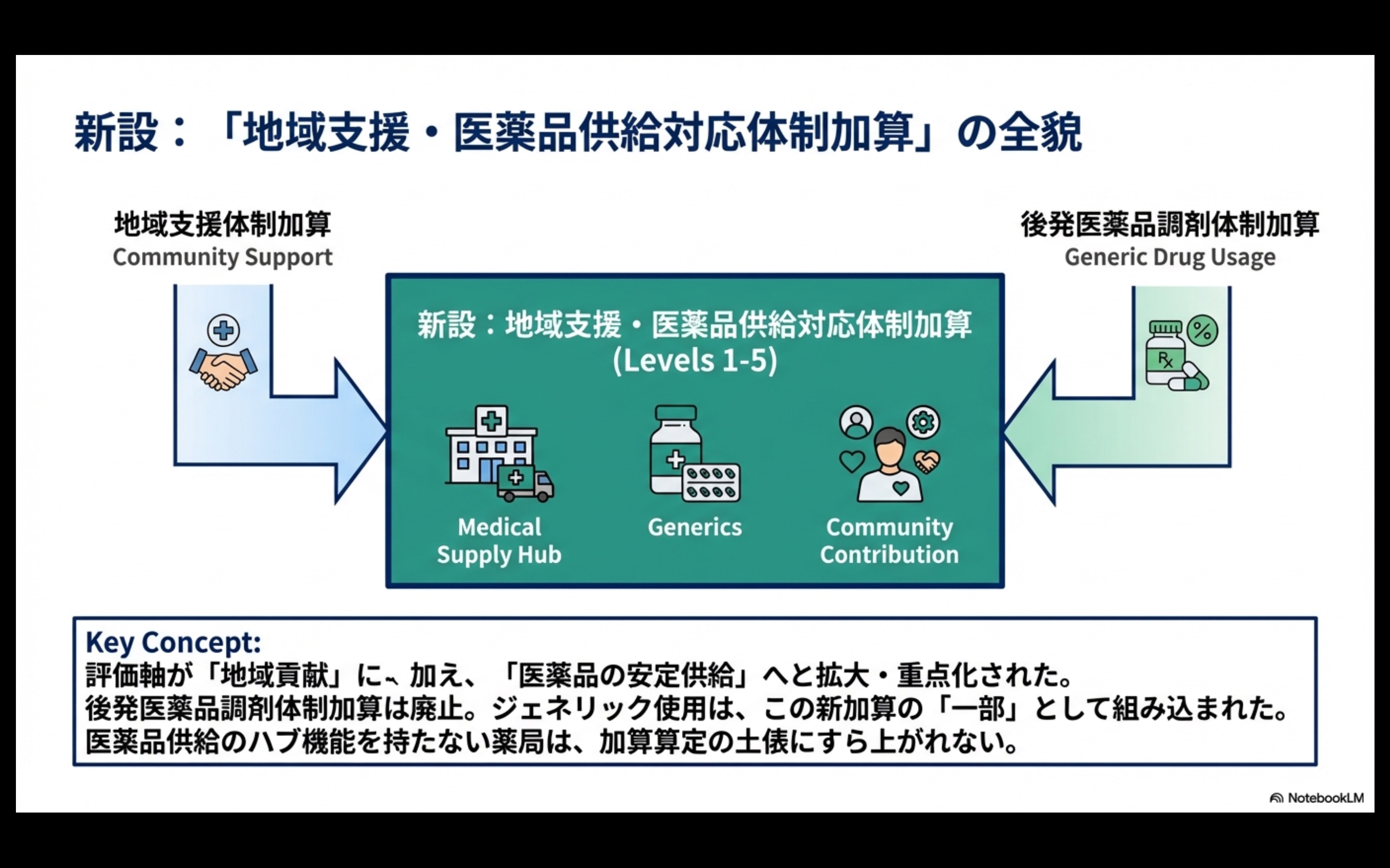 従来は別々の加算だったため、「後発品加算は無理でも地域支援で稼ぐ」という戦略が可能でした。