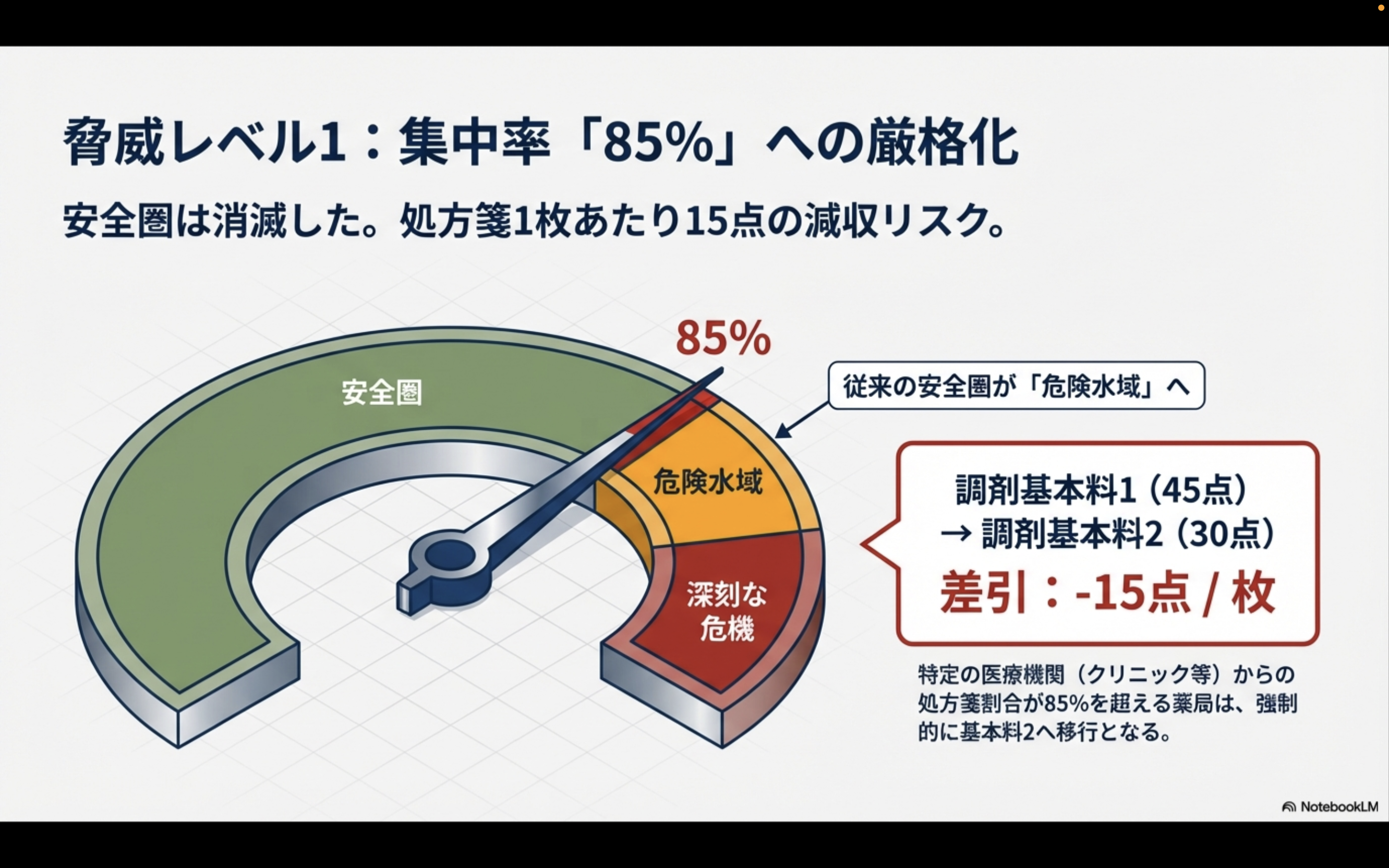 これまで「安全圏」とされていた集中率85〜95%の薬局が、一気に減収ゾーンへ転落する可能性があります。