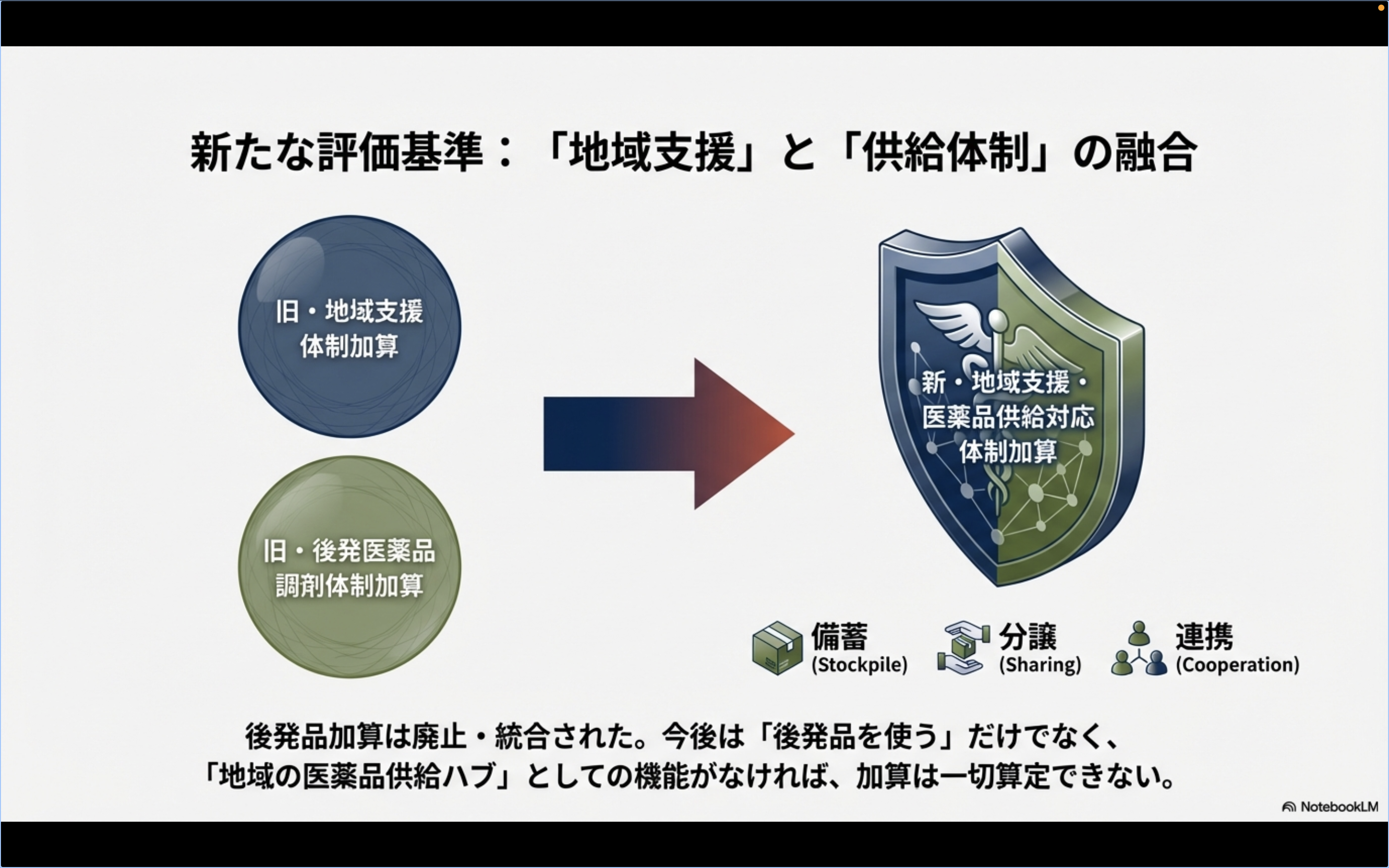 従来は別々の加算だったため、「後発品加算は無理でも地域支援で稼ぐ」という戦略が可能でした。