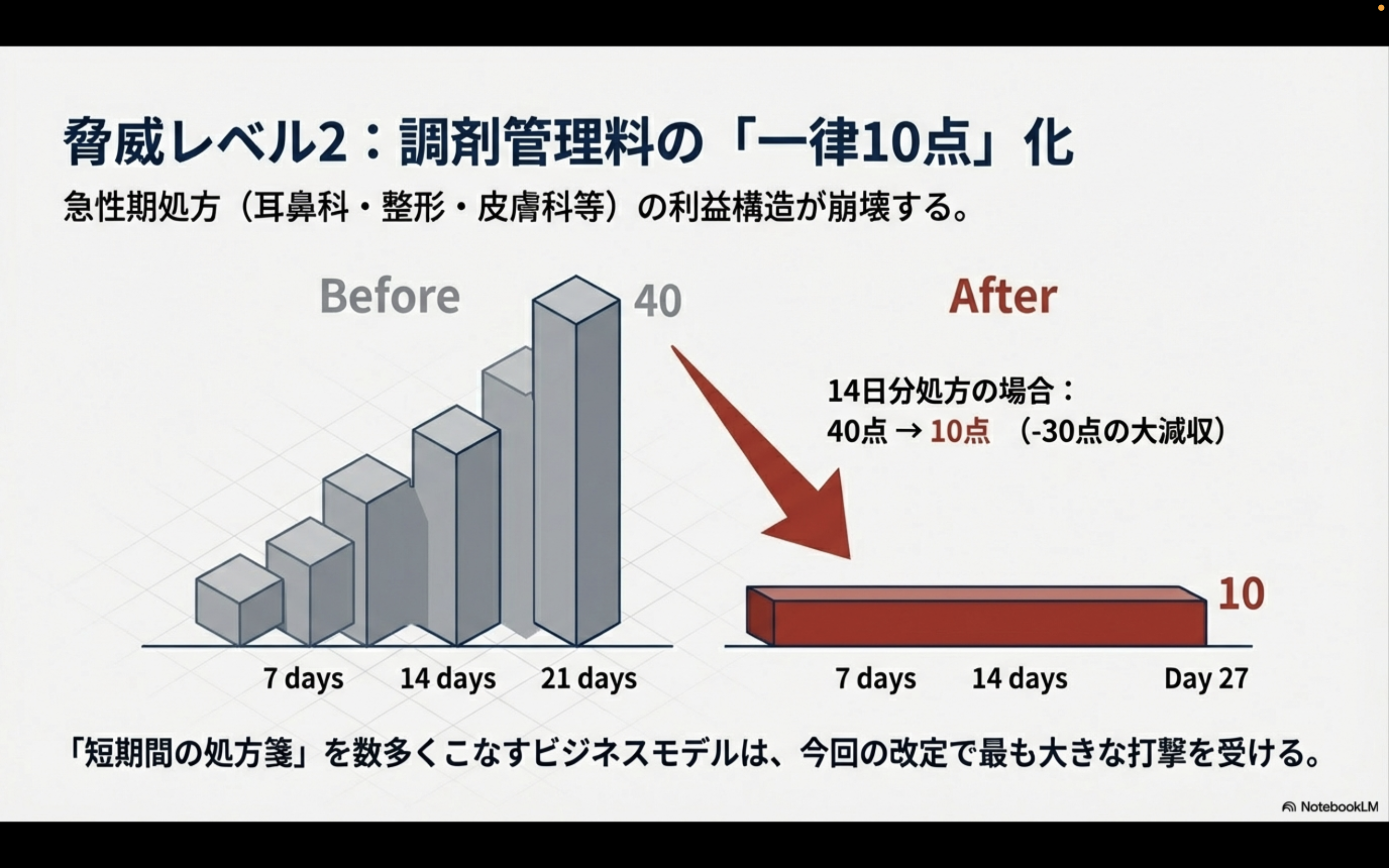 これにより、皮膚科や耳鼻科、整形外科の門前など、14日処方や21日処方が多い薬局は、大幅な減収となります。
