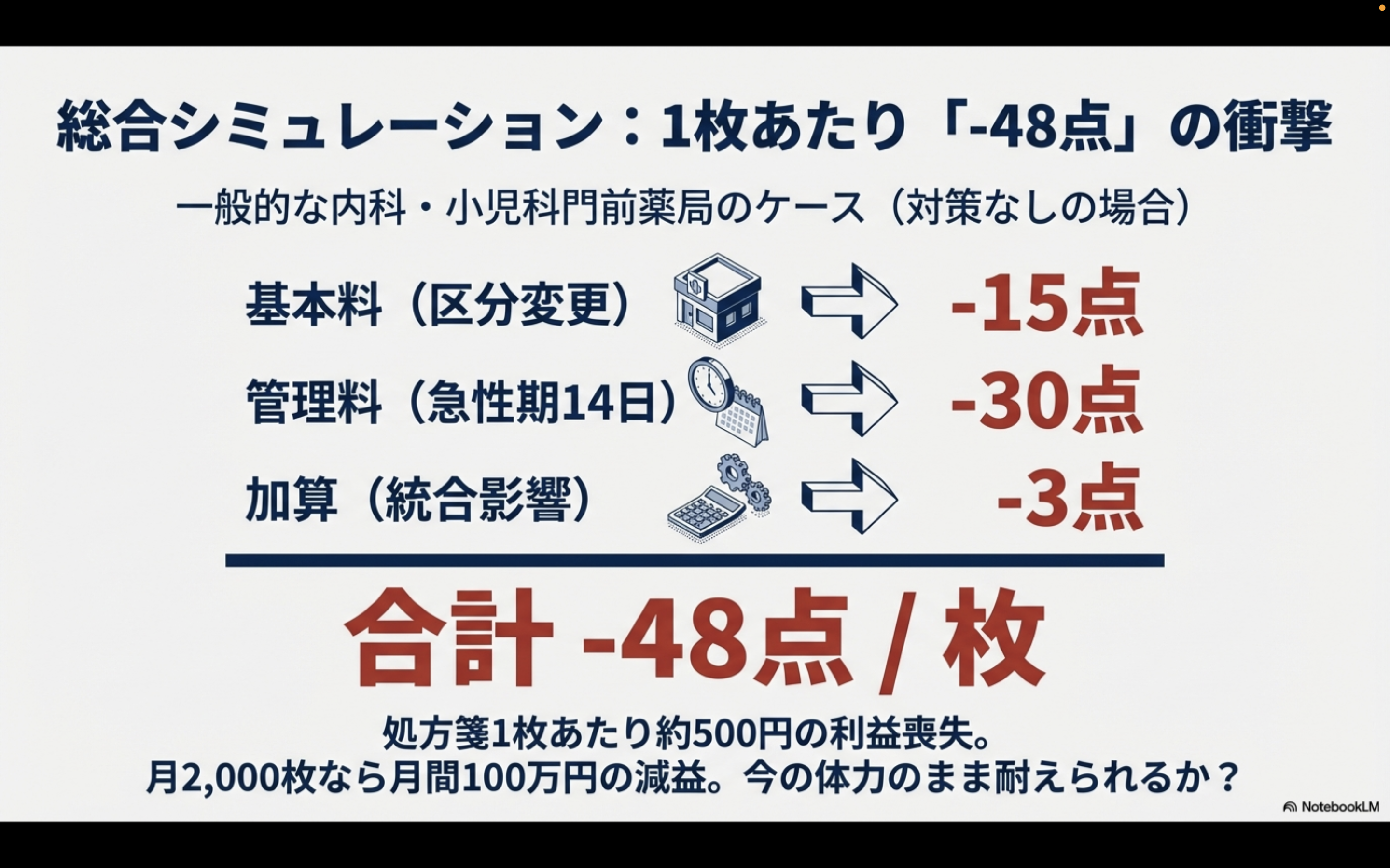 処方箋1枚あたり15点(45点→30点)の減収となり、年間で見ると大きな影響が出ます。
